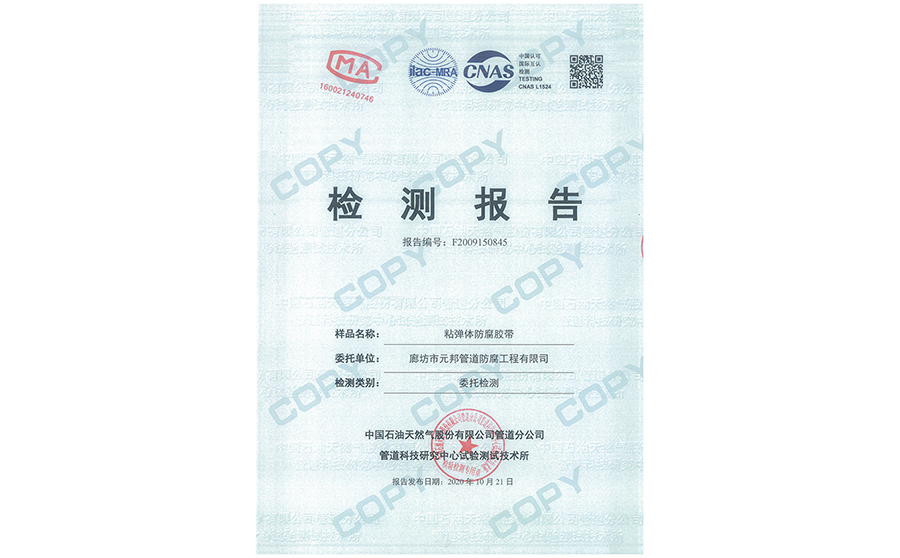 ? ? ? ? 全民塑膠生產(chǎn)的粘彈體膠帶,由廊坊市元邦管道防腐工程有限公司現(xiàn)場抽樣送檢,由國家認可實驗室依據(jù)CDP-S-OGP-AC-017-2013-2油氣管道工程粘彈體防腐材料技術規(guī)格書,對檢測項目、技術指標和試驗方法要求完全符合。