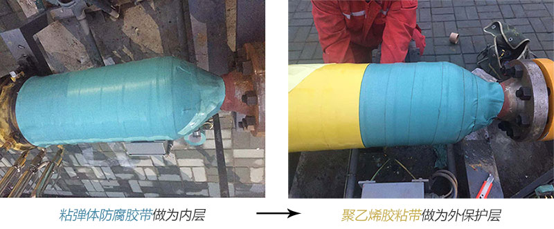 2018年度西氣東輸合肥站改造工程中整體埋地管路,閥室管件,地上高低壓分界點部位,選用了粘彈體防腐膠帶做為內(nèi)層防腐蝕主要材料,聚乙烯冷纏帶做為外保護層的工藝。效果非常好,一次性通過質(zhì)量驗收。