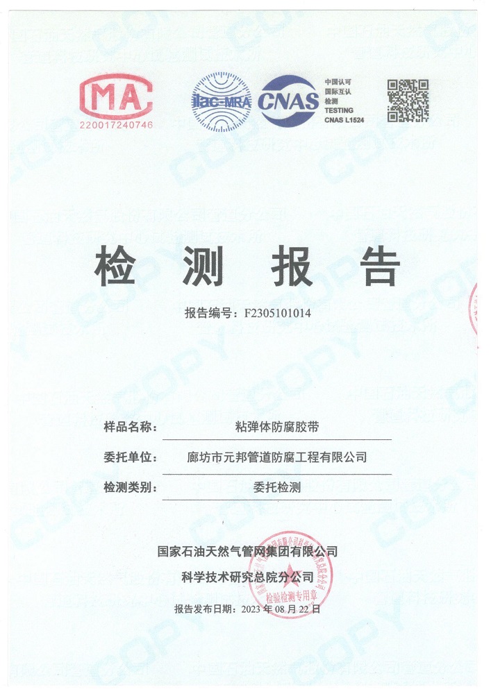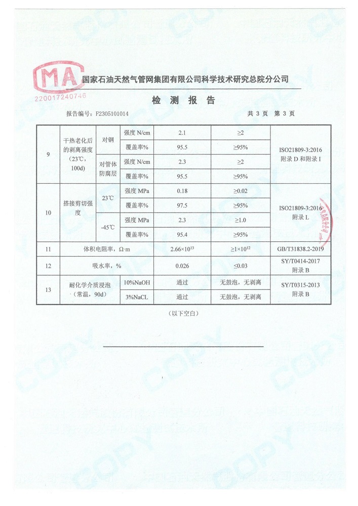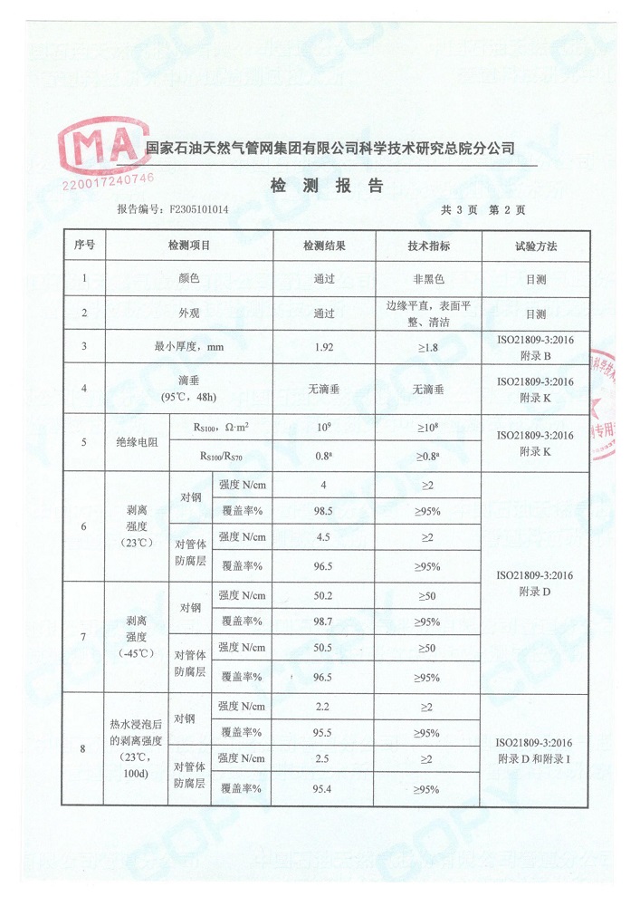 對PE23℃ 5.5N/cm 對PE-45℃ 60N/cm 對FBE23℃ 5.5N/cm 對FBE-45℃ 60N/cm 對鋼23℃ 5.5N/cm 對鋼-45℃ 60N/cm |